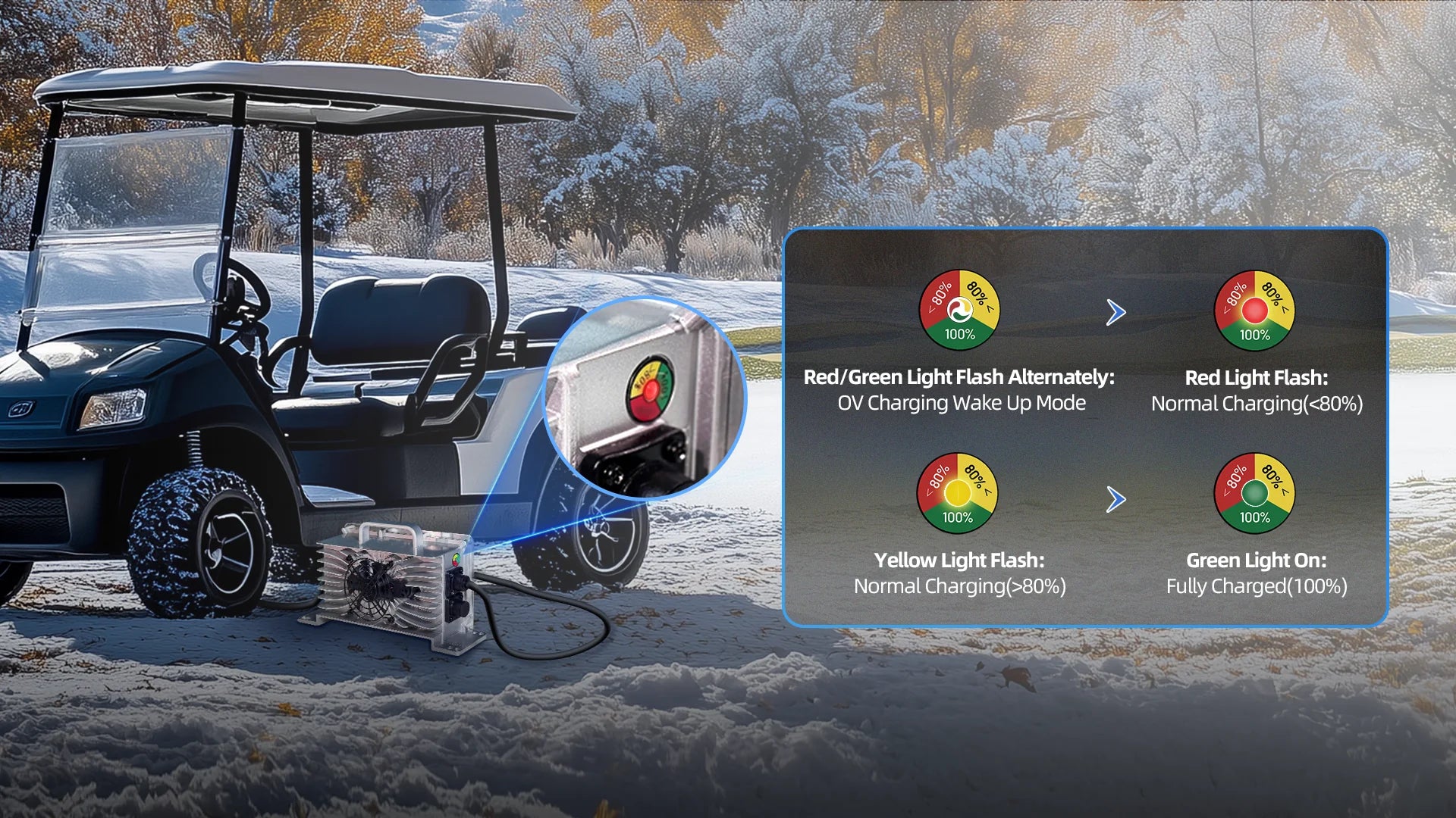 Stay informed with clear LED indicators: red/green flashing for wake-up mode, red flashing for normal charging (<80%), yellow flashing for normal charging (>80%), and green for fully charged (100%).