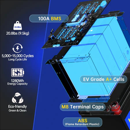 And the size of a WattCycle 12V 100Ah MINI LiFePO4 Battery is about 9.01″ (L) x 5.14″ (W) x 8.18″ (H).