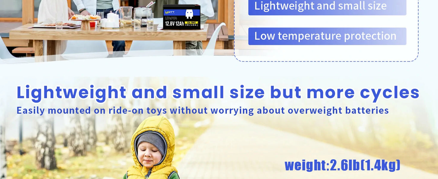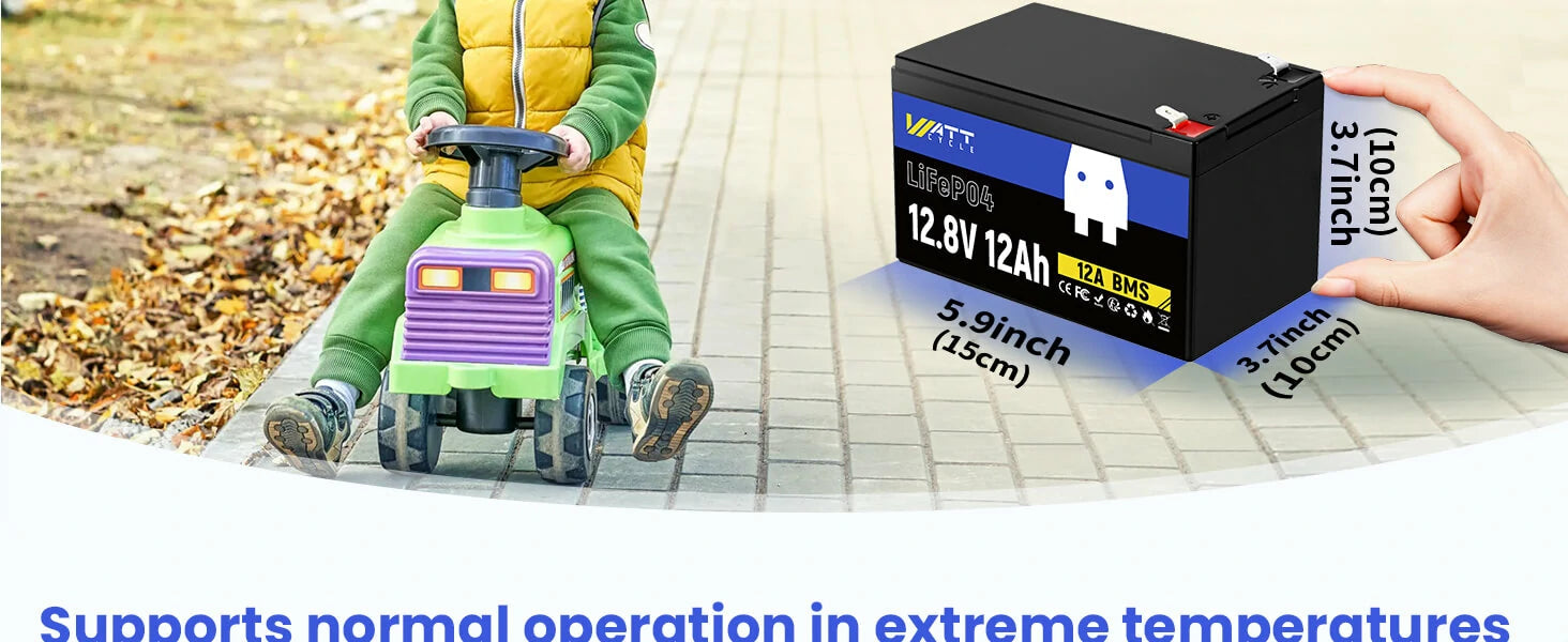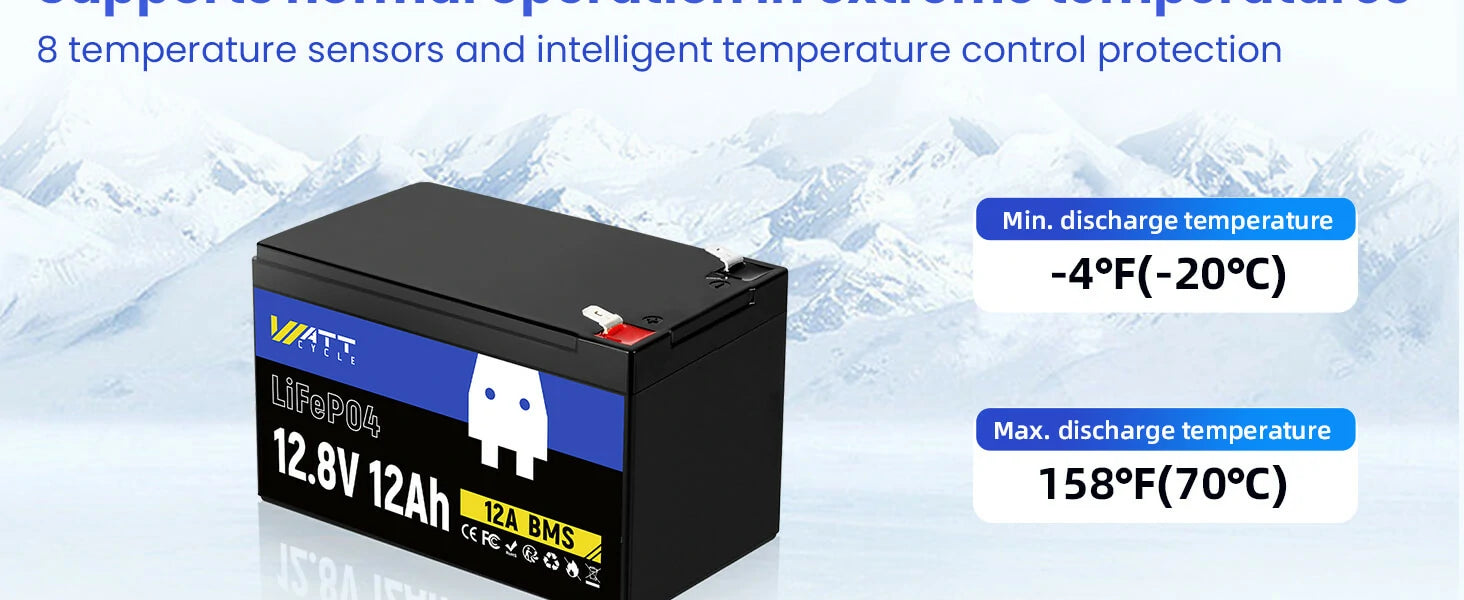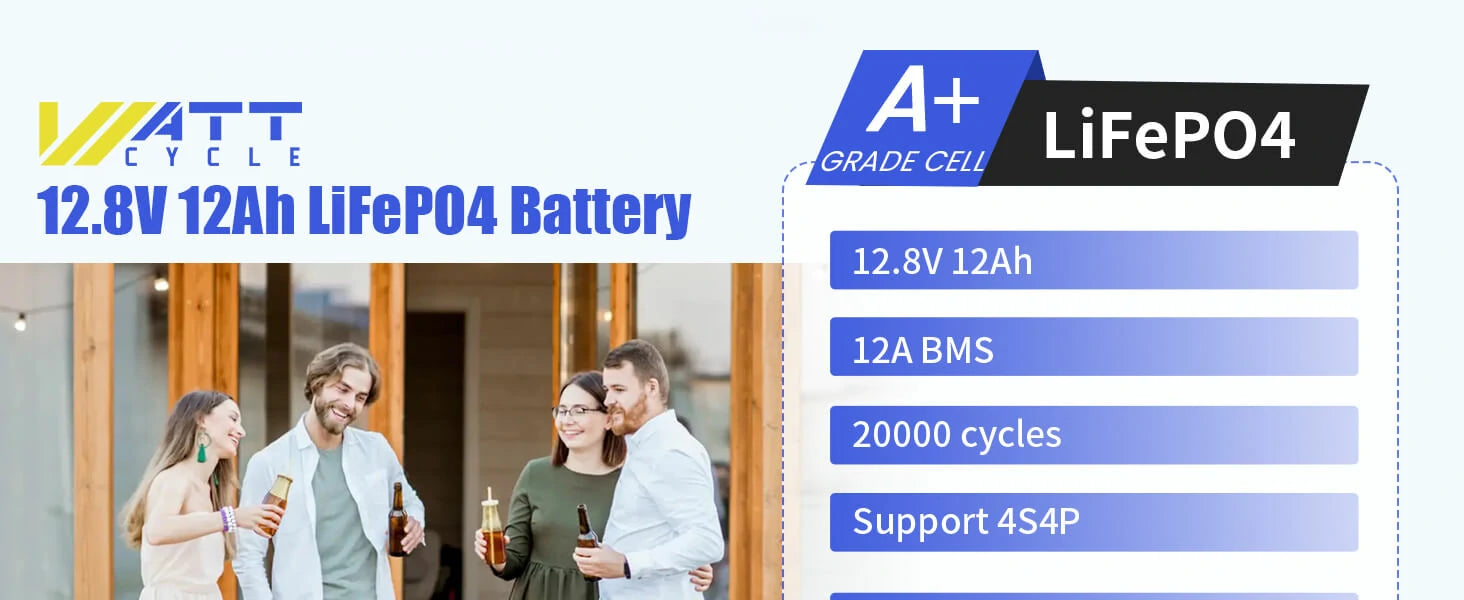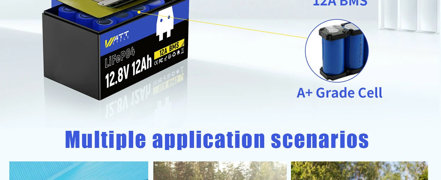 - 12V 12Ah LiFePO4 Battery: Compared with traditional lead-acid batteries, WattCycle LiFePO4 battery is made of the latest lithium-ion material, the battery doesn't contain any heavy metal elements, it's safer and more environmentally friendly. The 12v battery has the advantages of high energy density, long cycle life, good safety performance and no harmful hydrogen gas.