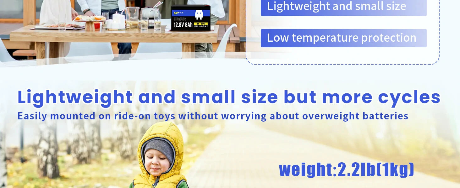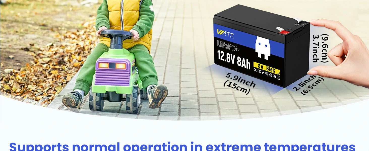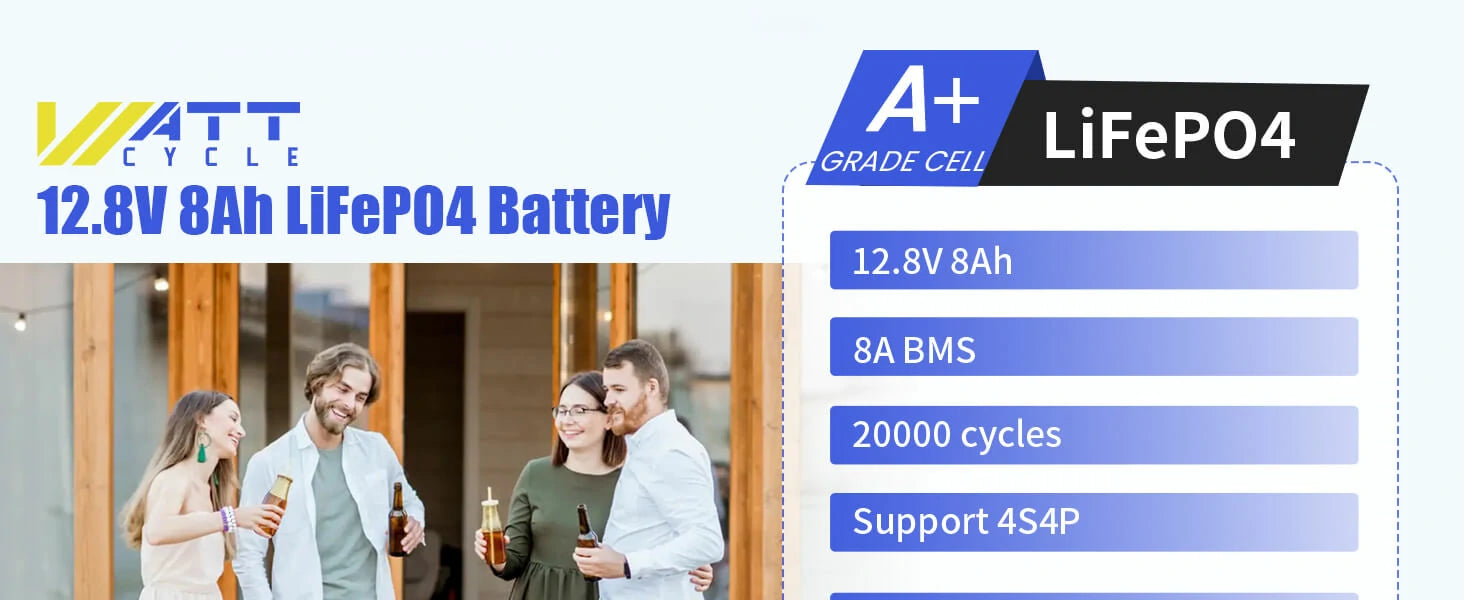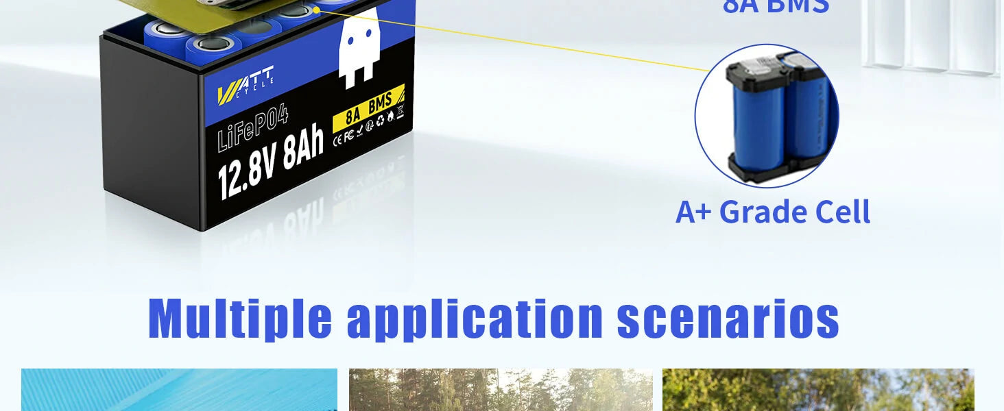 - 12V 8Ah LiFePO4 Battery: Compared with traditional lead-acid batteries, WattCycle LiFePO4 battery is made of the latest lithium-ion material, the battery doesn't contain any heavy metal elements, it's safer and more environmentally friendly. The 12v battery has the advantages of high energy density, long cycle life, good safety performance and no harmful hydrogen gas.