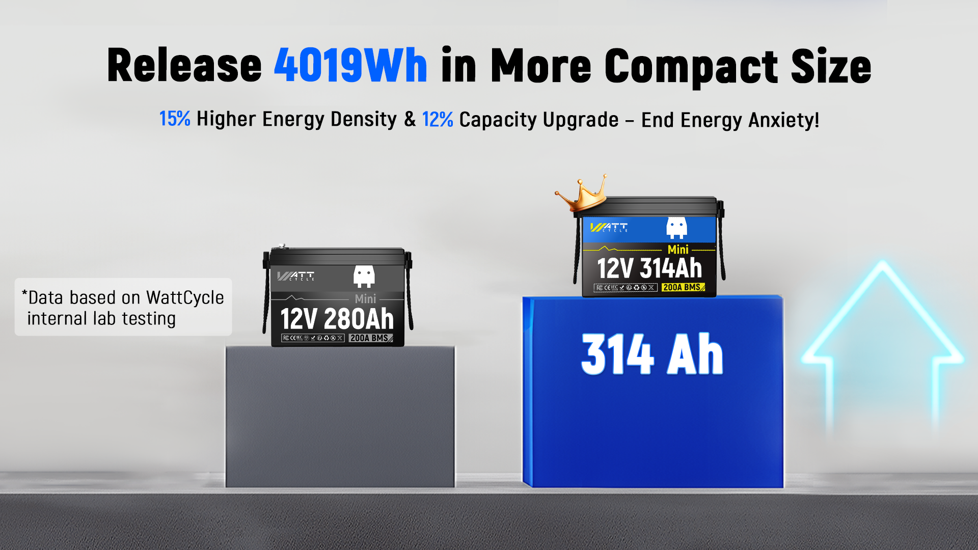 WattCycle 12V 314Ah LiFePO4 Battery—your high-capacity solution delivering a true 314 Ah (4.01 kWh) energy reserve in a compact, portable package. Perfectly suited as an upgrade from any “12V 300Ah lithium battery,” it gives you the extra runtime you’ve been looking for without adding bulk.