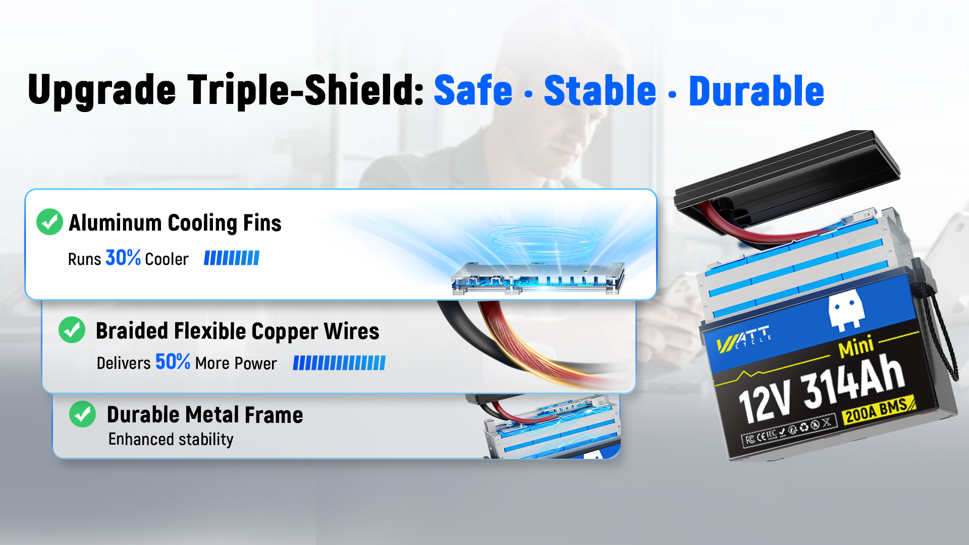 The WattCycle 12V 314Ah LiFePO4 Battery stands up to harsh conditions thanks to its unique full-aluminum internal frame,Which not only reinforces the cell structure but also integrates cooling fins that improve heat dissipation by 30 %. That means during heavy discharge or rapid charging, excess warmth is whisked away faster—protecting cell health and maintaining peak performance. Meanwhile, braided copper wires have been newly added inside the battery, enabling it to provide more than 50% of the power with the minimum voltage drop. This three-tier design makes it one of the safest 12V 300Ah deep cycle battery options on the market.