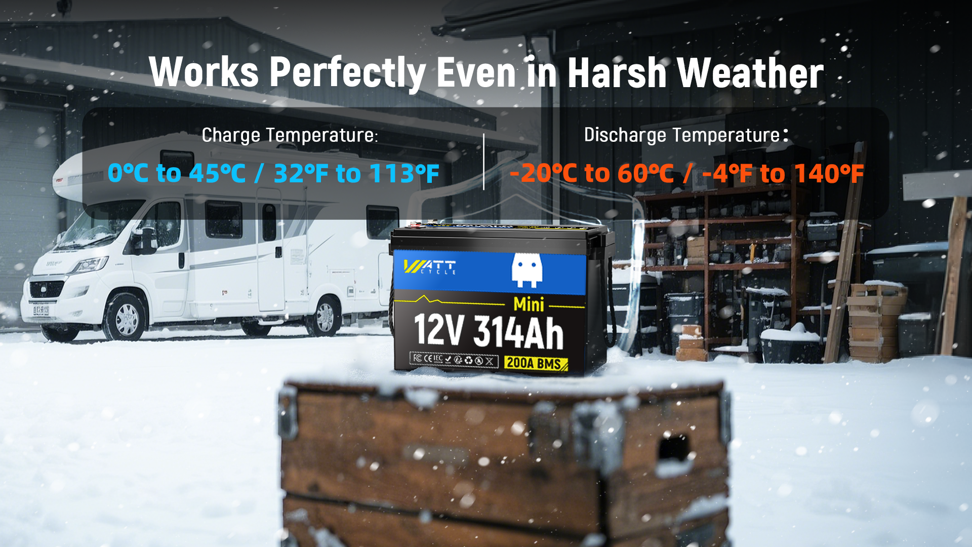 Whether you’re charging in 113 °F summer heat or discharging at –4 °F ice-fishing, this battery keeps pace. Charge range: 32 °F to 113 °F (0 °C–45 °C). Discharge range: –4 °F to 140 °F (–20 °C–60 °C). For anyone running a “solar battery 12V 300Ah” system in extreme climates, this pack won’t flinch.
