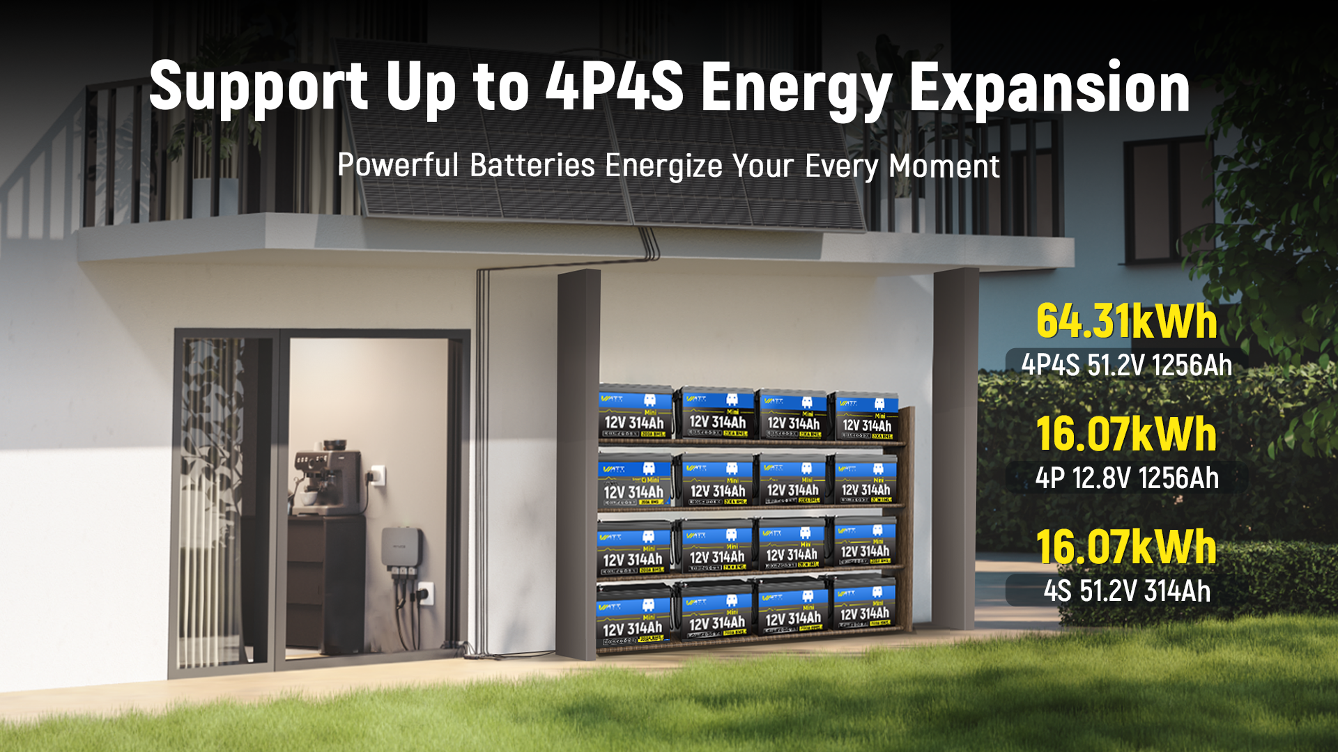 Scale up your array with extra WattCycle battery to build a 4S4P (64.3 kWh) mega-bank ideal for large solar arrays or whole-home backup. your go-to for WattCycle 12V 314Ah batteries that need to grow as your demand does.