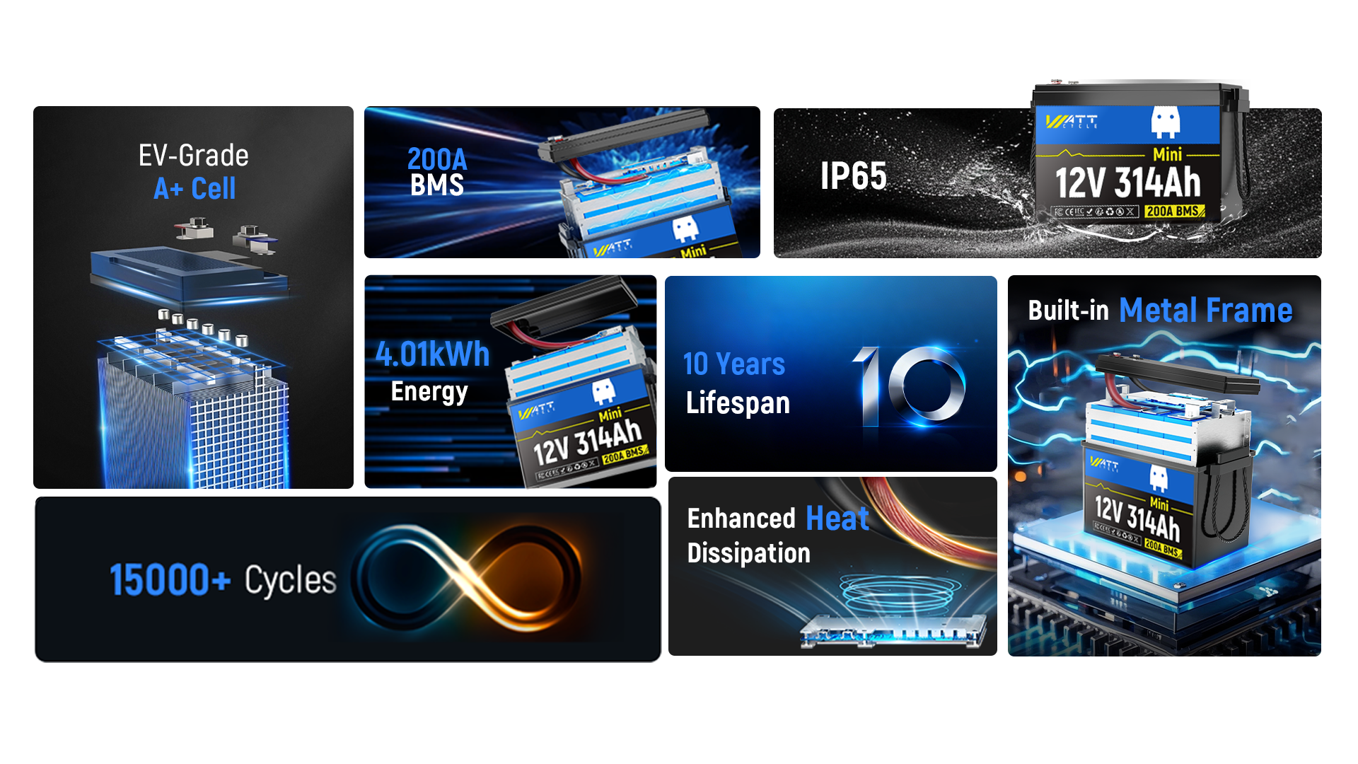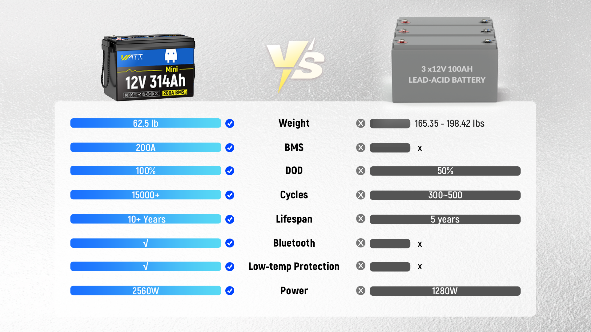 For those running three 12V 100Ah batteries in parallel, you’d typically combine to 300 Ah. That setup adds weight, wiring complexity, and more points of failure. By choosing one WattCycle 314Ah MINI battery instead. you get additional benefits.